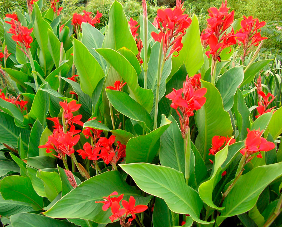 Сорт "Президент" представляет собой растение высотой около 1 метра с яркими красными цветками, собранными в соцветия длиной до 30 см. Листва у этого сорта зеленая, что создает красивый контраст с насыщенными цветами. Канны — это многолетние травянистые растения с разветвленными корневищами и крупными листьями, расположенными в два ряда на укороченных стеблях. Цветки канн отличаются своей асимметричностью и крупными размерами, достигая 4-8 см в диаметре. Они могут быть ярко-желтыми, оранжевыми или красными, а некоторые виды даже имеют белые цветки. Все цветки обоеполые.