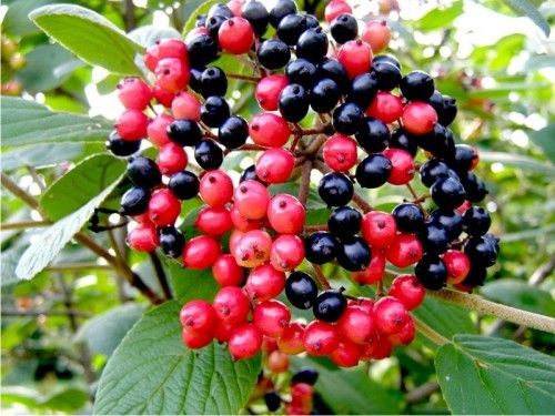 В июне кустарник украшен многочисленными кремово-белыми соцветиями, состоящими из одинаковых цветков диаметром около 1,5 см. Цветение продолжается с мая по июнь и длится 15-25 дней. После цветения образуются плоды-костянки, которые при созревании меняют цвет с красного на черный, создавая эффектный контраст. Полное созревание плодов происходит в сентябре, и они украшают растение более 20 дней.