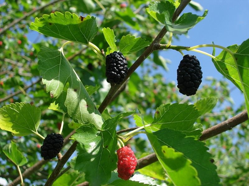Шелковица, также известная как тутовник, представляет собой дикорастущее дерево, которое без обрезки может вырасти до 15 метров в высоту. Кора дерева темно-бурого цвета с небольшими трещинками. В возрасте 10-12 лет ствол может достигать толщины до 1 метра. Листья на одном дереве могут быть разной формы и размеров: от яйцевидных до сердцевидных у основания. Листья темно-зеленые и гладкие на ощупь. Цветки небольшие, собраны в соцветия-сережки. Плоды представляют собой округлые орешки, расположенные на разросшемся цветоложе, и напоминают внешне ежевику или малину. Ягоды могут быть от беловато-зеленоватого до фиолетового цвета и достигают длины до 5 см. Мякоть ягод сочная, сладкая и ароматная. Ягоды созревают в конце июня и могут употребляться как в свежем, так и в переработанном виде.