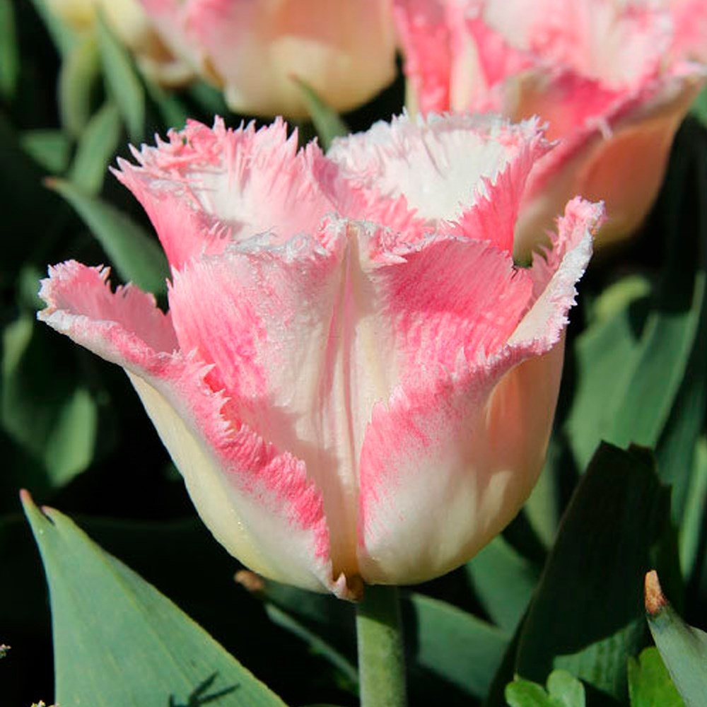 Тюльпан Линжери (Lingerie) – это изысканный сорт, который привлекает внимание своей утонченной двухцветной окраской. Нижняя часть лепестков окрашена в кремовый цвет, а верхняя часть – в нежно-розовый с изящной игольчатой бахромой. Цветоносы достигают высоты 40-45 см и отличаются особой прочностью, что делает их устойчивыми к ветрам.